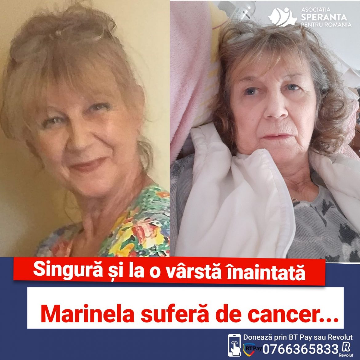 Doamna Marinela și-a petrecut Sărbătorile singură, cu suferința bolii apăsând greu asupra sa. Pe zi ce trece se simte tot mai slăbită, iar boala progresează. Am reușit să îi trimitem o parte din fondurile care s-au strâns până în prezent pentru a își achita plata chirirei. În afară de ajutorul nostru, Marinela nu mai are la cine să apeleze!